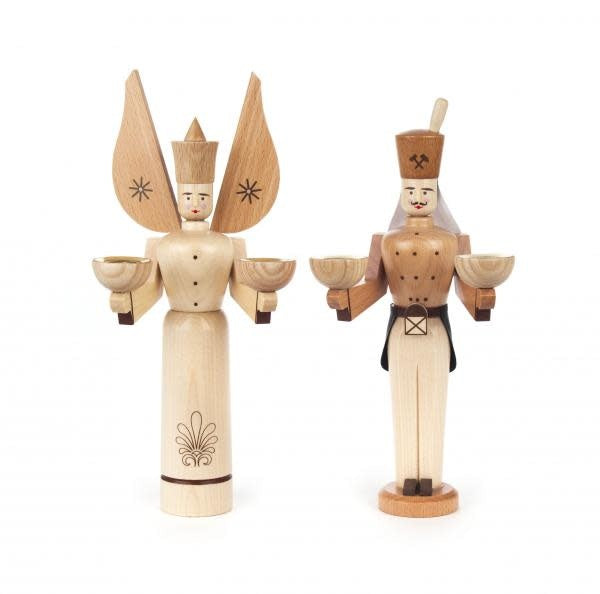The angel and miner are perhaps the most famous pair in the Erzgebirge Christmas tradition. They bring a festive glow to your home with their natural charm, perfect for holding candles.