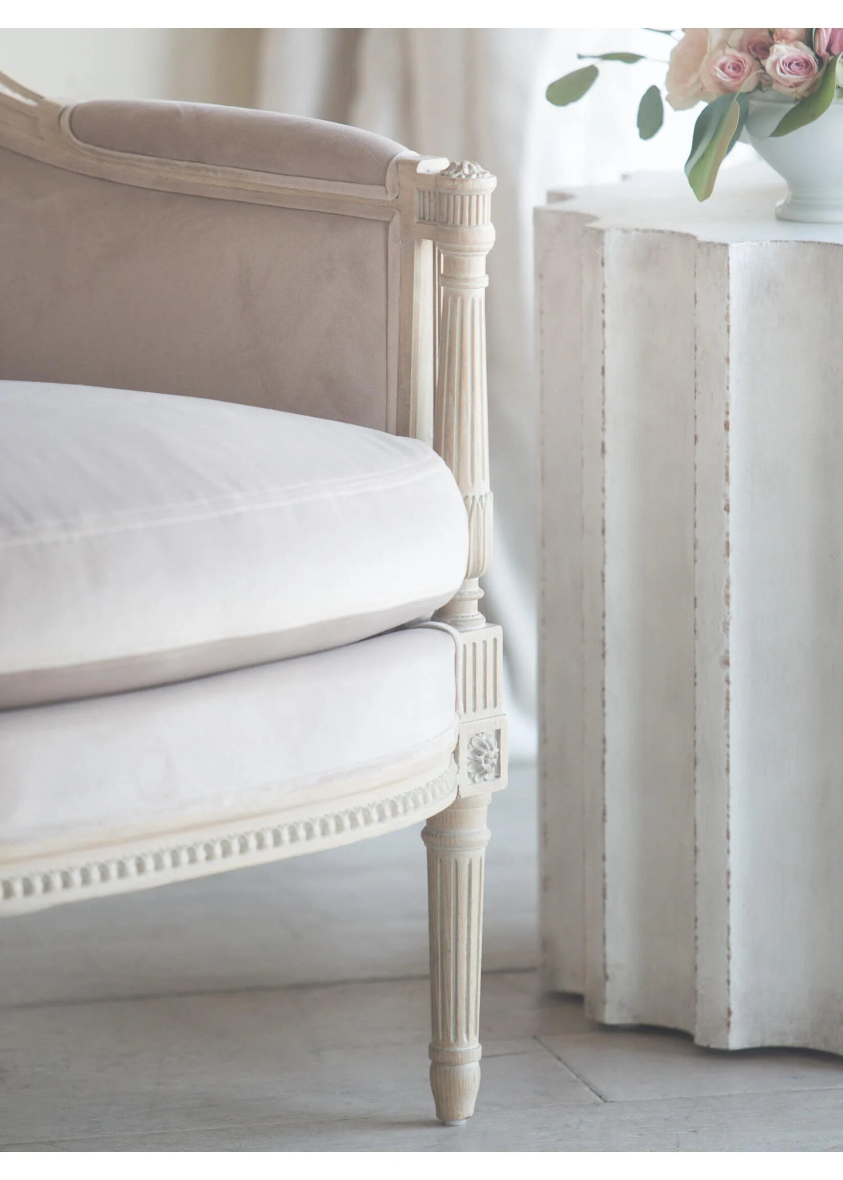 The Eloquence® Minerva Bergere is a distinguished re-edition of a classic Directorie antique. The Minerva Bergere is an elegant piece crafted from acacia wood. Traditional, hand-carved details are on show in the fluted legs, rosettes and columns that hold up circular-ended armrests. The feather, foam-wrapped cushion brings a comfortable finish to this piece.