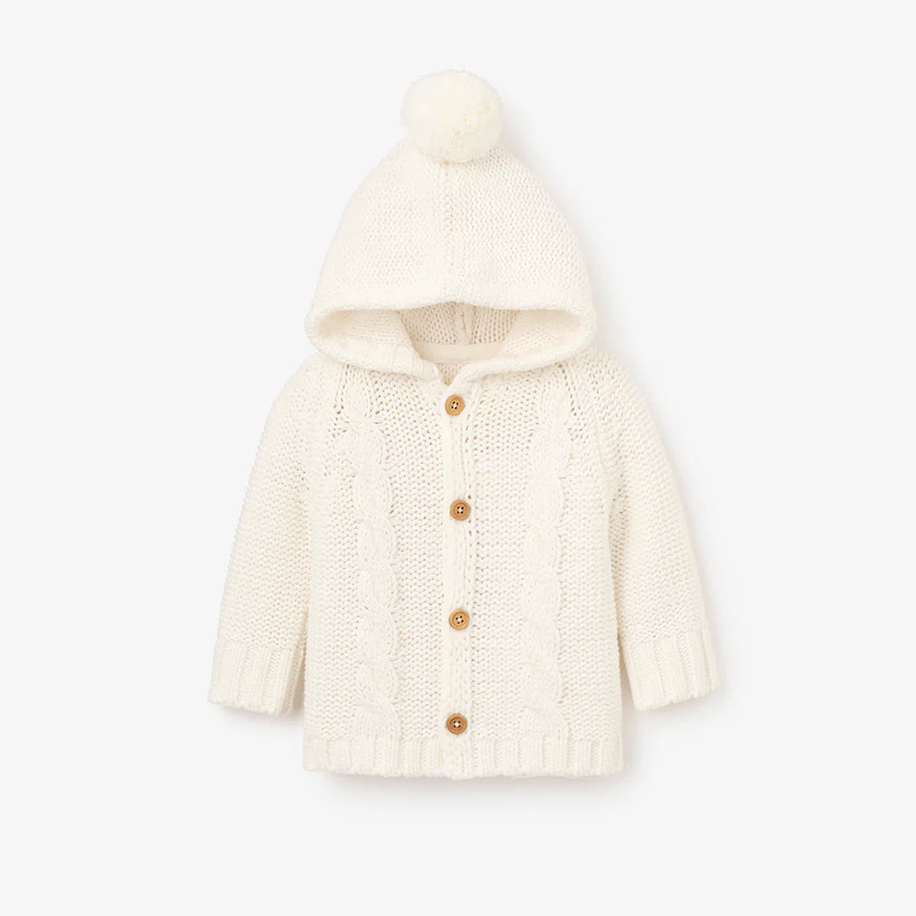 Complete a baby's stylish look with our fashionable and silky soft pom pom hooded, cable knit cardigan. A soft blend of cotton and acrylic, our sweater keeps its shape and is designed to fit cozily with wooden buttons.