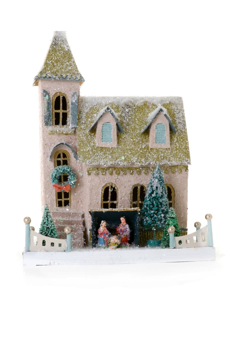 These artfully designed and hand-painted houses are crafted from durable cardboard, effortlessly blending intricate details like bottle brush, beads, and festive adornments. From the snow-kissed rooftop to the shimmering base below, the house is covered in glitter and will make any display sparkle.