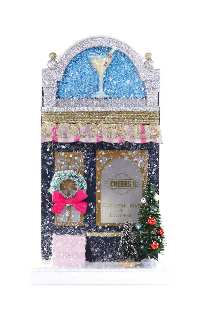 These artfully designed and hand-painted houses are crafted from durable cardboard, effortlessly blending intricate details like bottle brush, beads, and festive adornments. From the snow-kissed rooftop to the shimmering base below, the house is covered in glitter and will make any display sparkle.