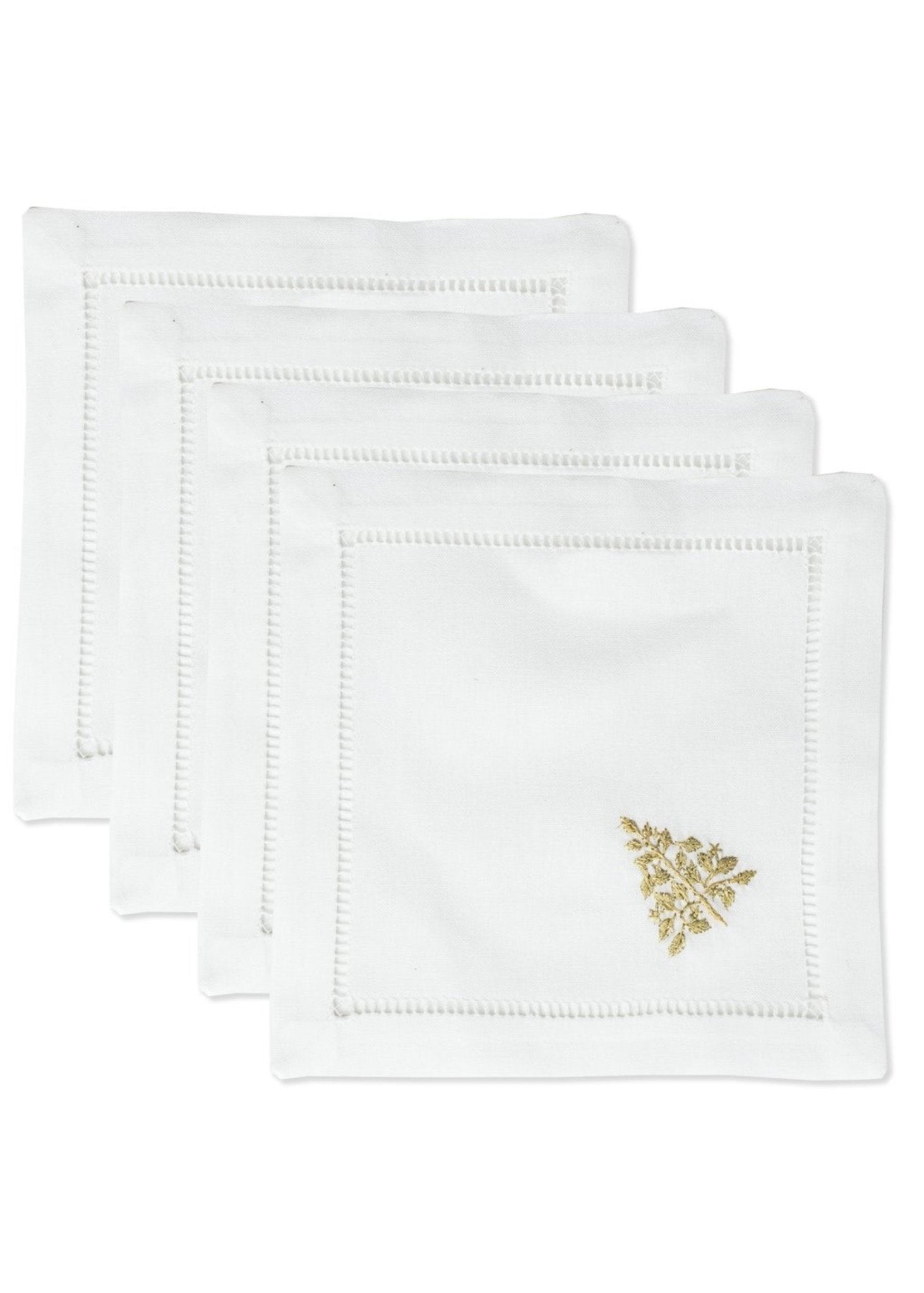 Hand-embroidered cocktail napkins on 100% cotton, finished and hemstitched by hand.