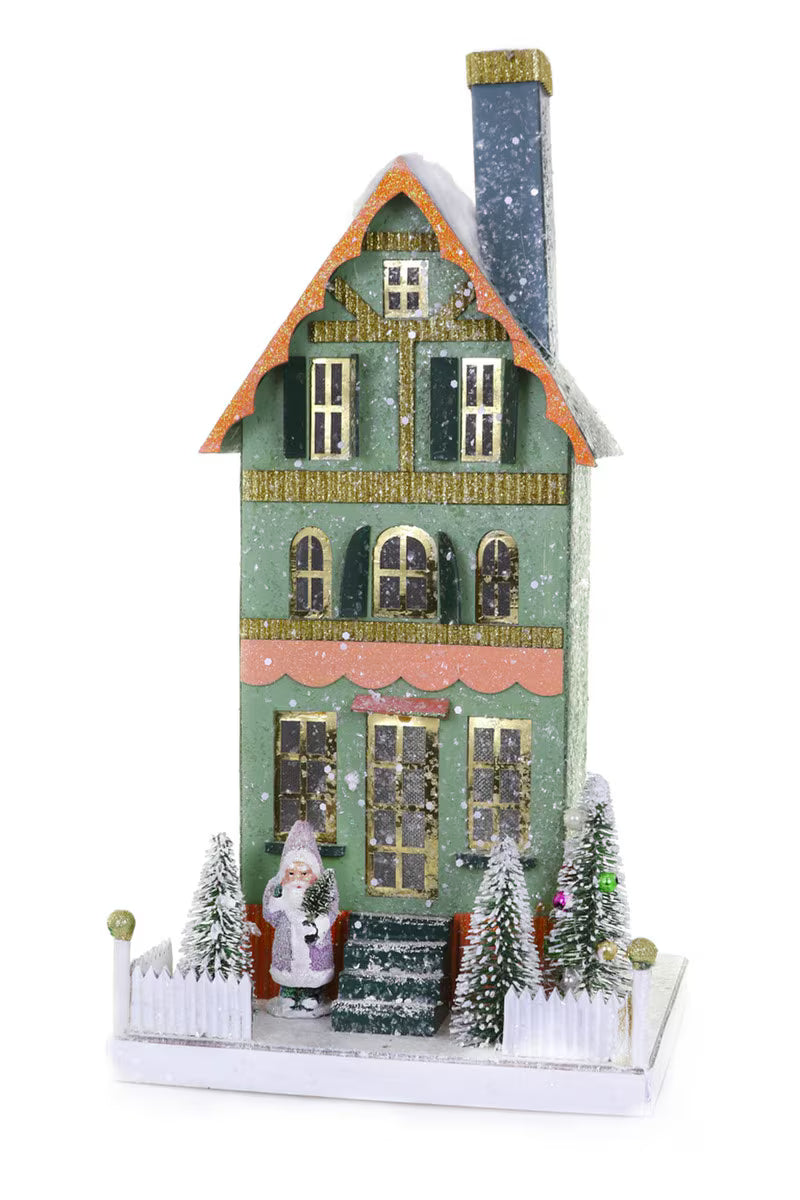 These artfully designed and hand-painted houses are crafted from durable cardboard, effortlessly blending intricate details like bottle brush, beads, and festive adornments. From the snow-kissed rooftop to the shimmering base below, the house is covered in glitter and will make any display sparkle.