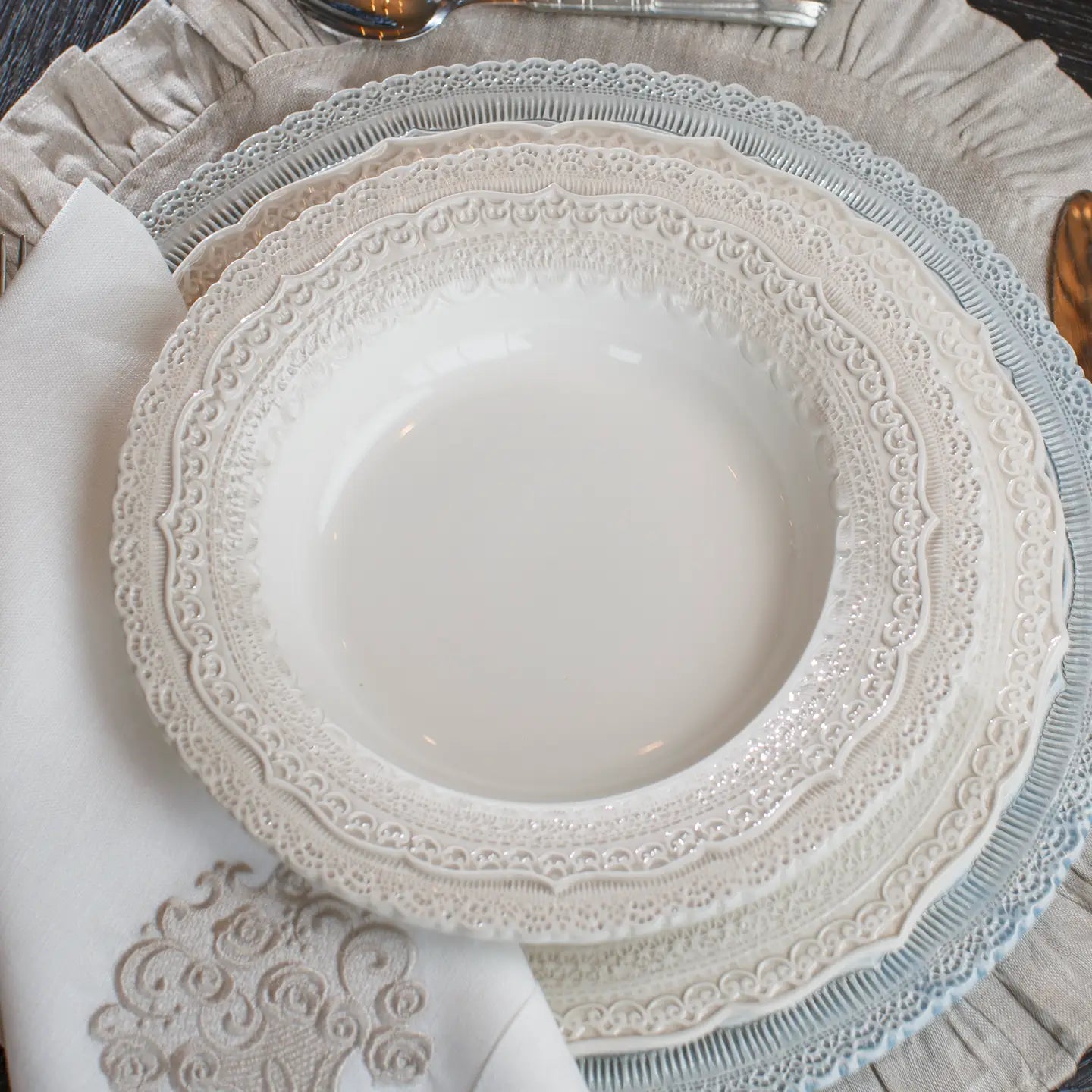 Introduced over a decade ago, Finezza (meaning "refined") is one of Arte Italica's best selling collections year after year. Beloved for its intricate lace design, it is beautiful, durable and easy care. Simple elegance for every day living.