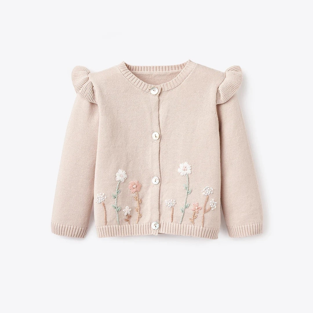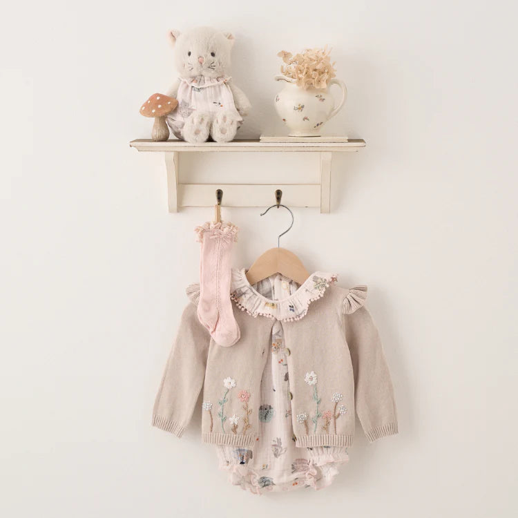 This hand-embroidered cardigan is simply stunning! Elegantly finished with pearl buttons and ribbed trim, it is the perfect layering piece to the garden picnic collection.
