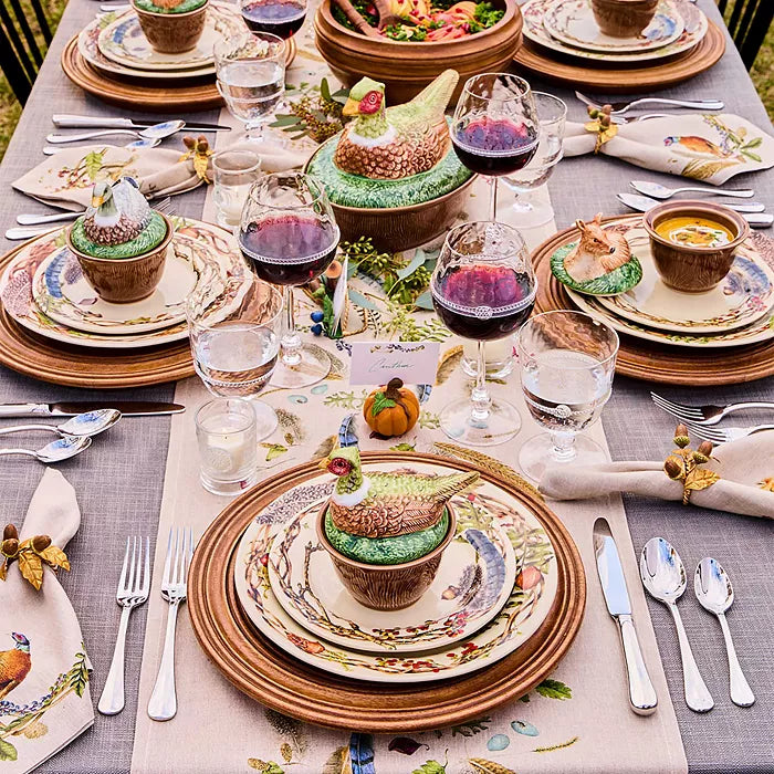 The irresistible fauna and fowl of the autumn woods capture the imagination and add enchantment to your fall tablescapes with beautifully sculpted likenesses hand-painted in Portugal, with intricate detail, atop ceramic bowls featuring a rich woodgrain motif. Rabbit, Pheasant, Deer and Duck are ideal for serving soups, desserts, or condiments—and are always ready to party.