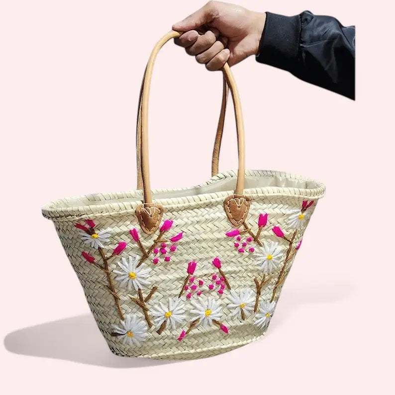 Brighten up your summer collection with this stunning handcrafted Moroccan straw bag, featuring vibrant floral embroidery in white, pink, and yellow tones. Made from durable palm leaves and finished with sturdy genuine leather handles, this stylish piece combines traditional weaving with modern flair. Ideal for beach days, markets, or everyday chic, the roomy interior is lined for added durability. Each bag is uniquely hand-embroidered, making it a one-of-a-kind accessory!