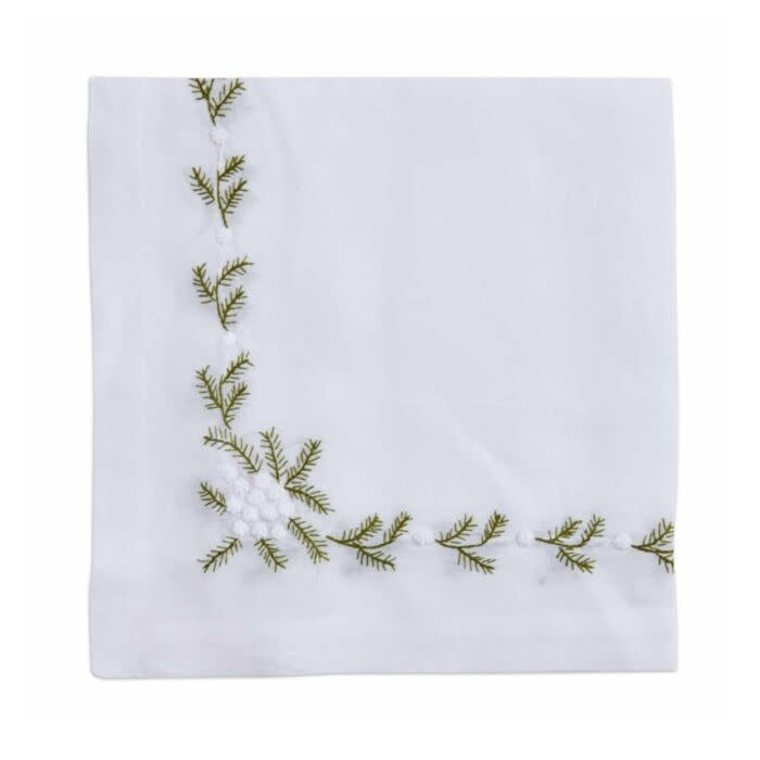 These Italian linen napkins are beautifully hand embroidered in Vietnam. This design mimics a walk in the winter woods. Inspired by the quiet scenery of snow, evergreens and berries. On holiday tables, old fashioned never goes out of style!