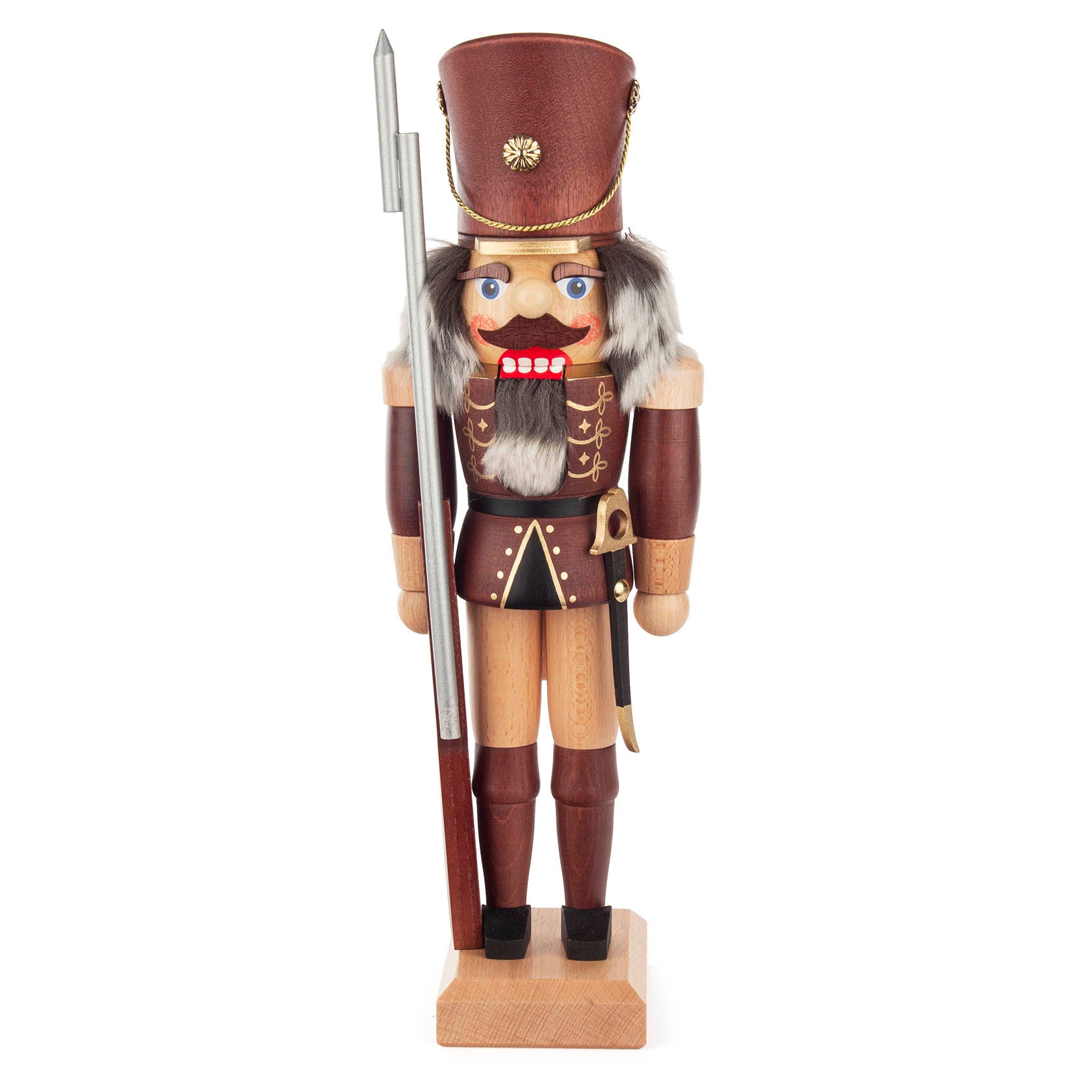 This wooden nutcracker soldier in brown stands 38 cm tall and is a classic piece of Erzgebirge folk art. With its traditional design, it adds a touch of elegance to any holiday decor. Please note that our nutcrackers are intended solely for decorative purposes.