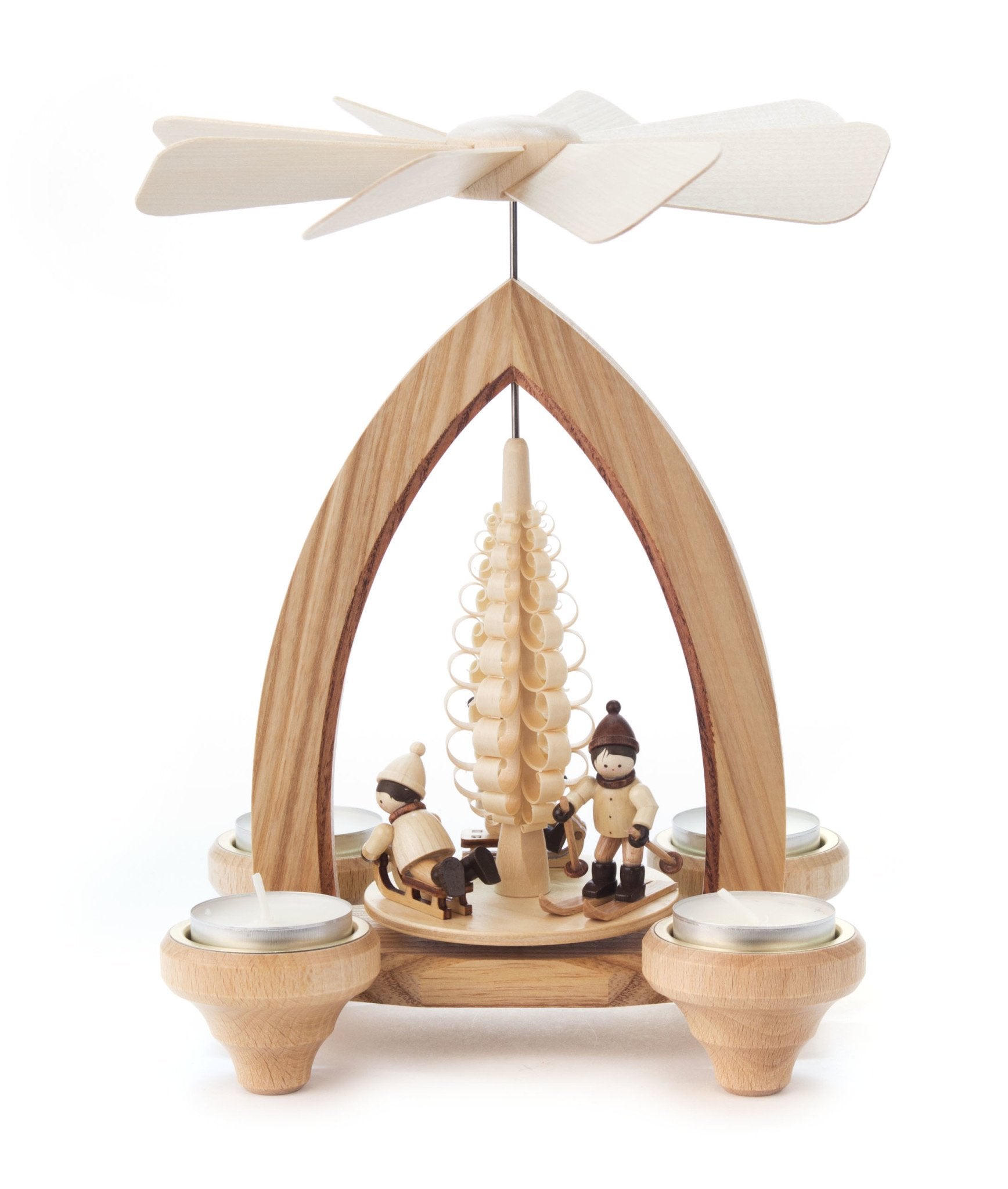 The pyramid with winter children for tealights brings traditional coziness into your home and is a true eye-catcher. Be enchanted by the playing winter children and enjoy the cozy atmosphere this Christmas pyramid creates. The craftsmanship from the Erzgebirge will captivate you, and the lovingly designed details will charm you. The pyramid is equipped with a wooden tree as its axis and is powered by tealights. The warmth of the candles gently rotates the wings of the pyramid, and the winter sports figures spin along.
