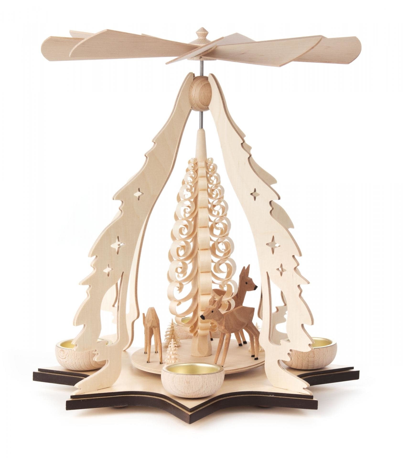 Experience the festive spirit of the Christmas season with our Pyramid with Deer. Crafted in the Erzgebirge, it features a natural wooden frame shaped like a Christmas tree. The rotating disc showcases three charming deer and three ringed trees, revolving around an artful chip tree axis. With space for four tealights and a star-shaped base, this pyramid is the perfect accessory for cozy evenings during Advent. Our Christmas pyramid makes a wonderful gift for your loved ones or a great addition to your holiday decor.