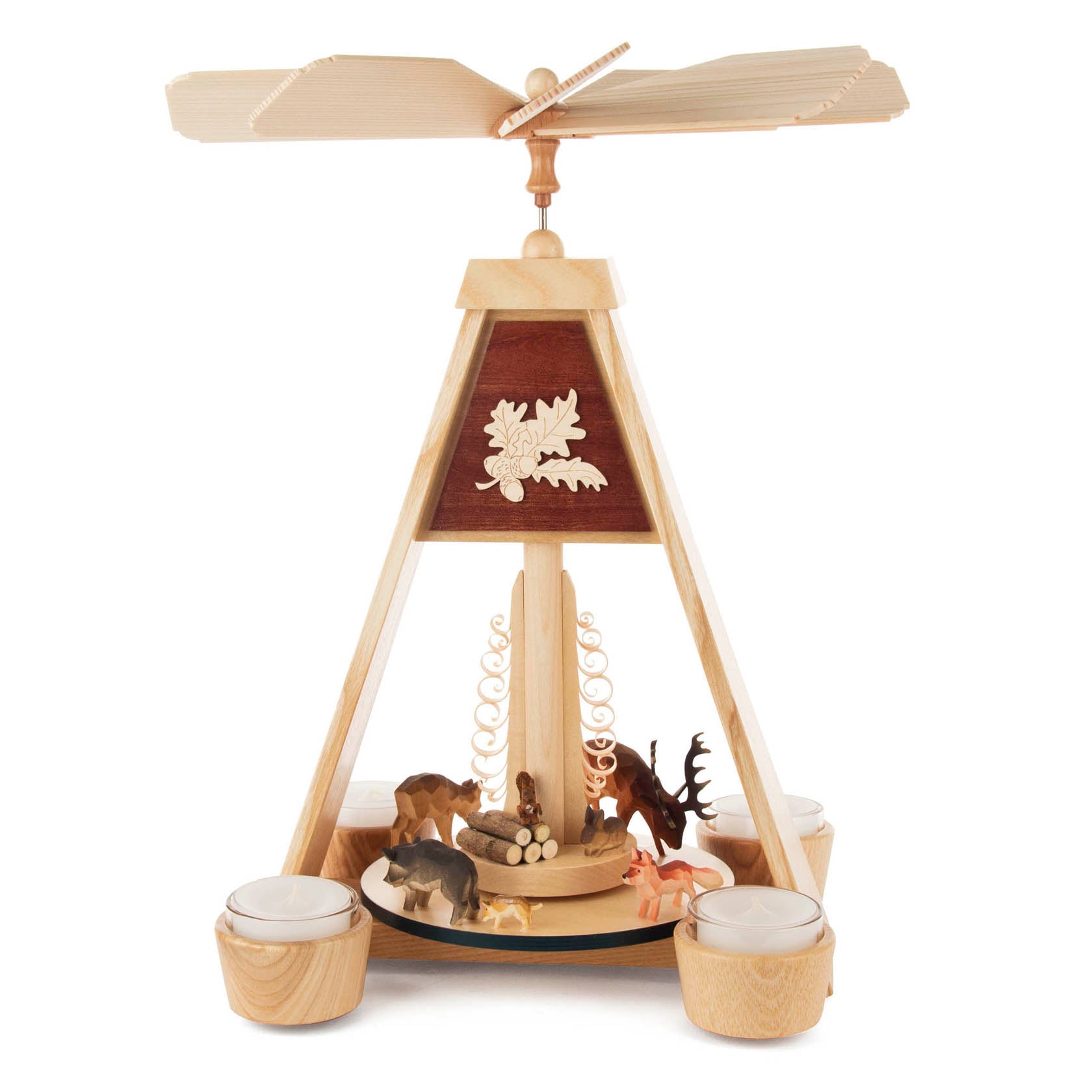 Bring the magic of the forest into your home with our Christmas pyramid featuring forest animals! The rotating platform showcases various forest animals, including a fox, a wild boar with its piglet, a squirrel on a woodpile, as well as a stag and a doe. These animals rotate around an axis adorned with wood shavings. The frame of the pyramid is decorated with oak leaf embellishments, completing the overall appearance perfectly. This handcrafted pyramid is suitable for tealights and creates a cozy atmosphere in any room. Whether as a decoration in the living room or a centerpiece on the dining table, the pyramid with forest animals is a true highlight.