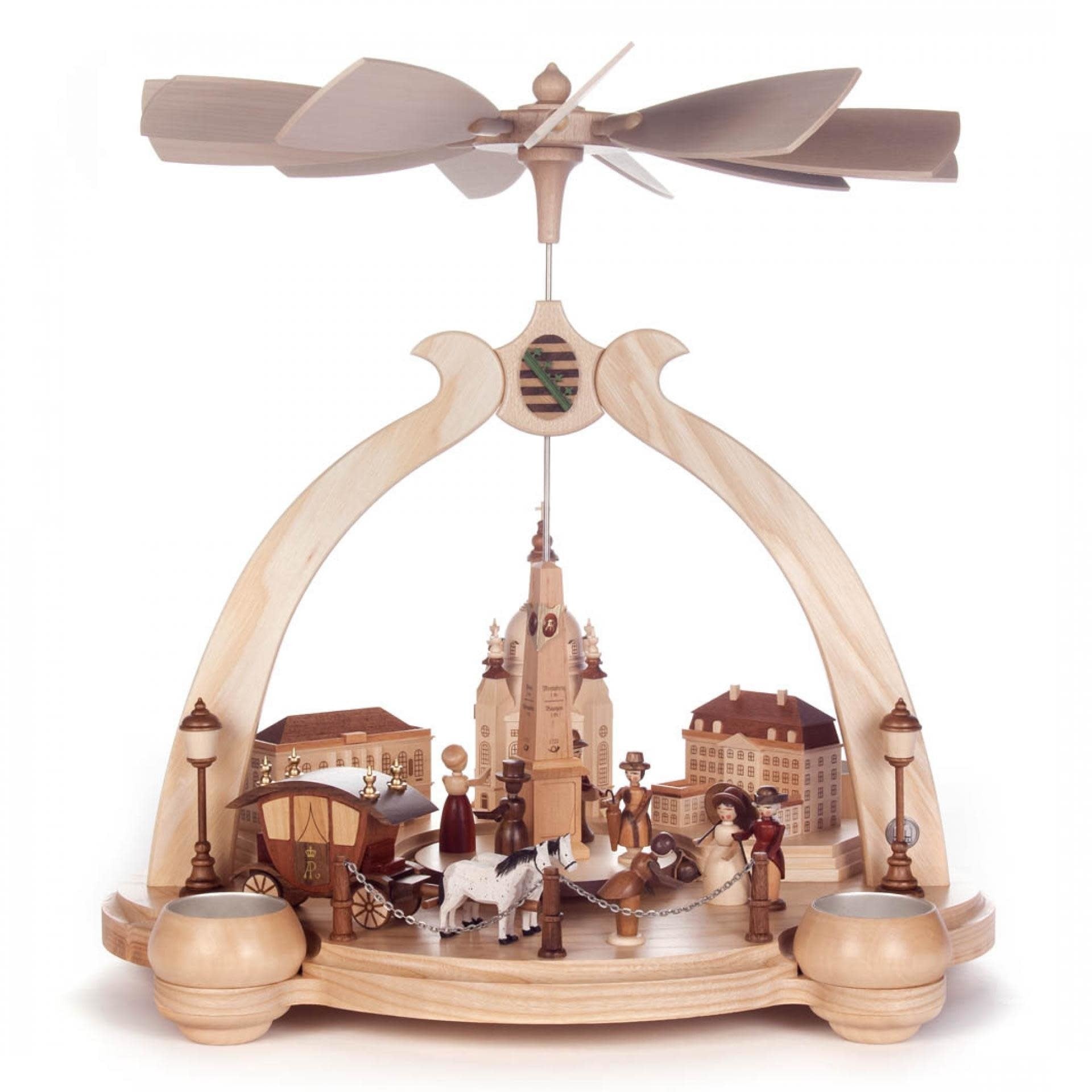 This Christmas pyramid recreates "Old Dresden" with charming details. It features city houses surrounding a marketplace, the Frauenkirche, a horse-drawn carriage, and many small figures, capturing a perfect scene from old Dresden. The pyramid is crafted in natural and brown tones, giving it a modern and unique appearance. For added coziness, simply light the tealights, and the pyramid comes to life.