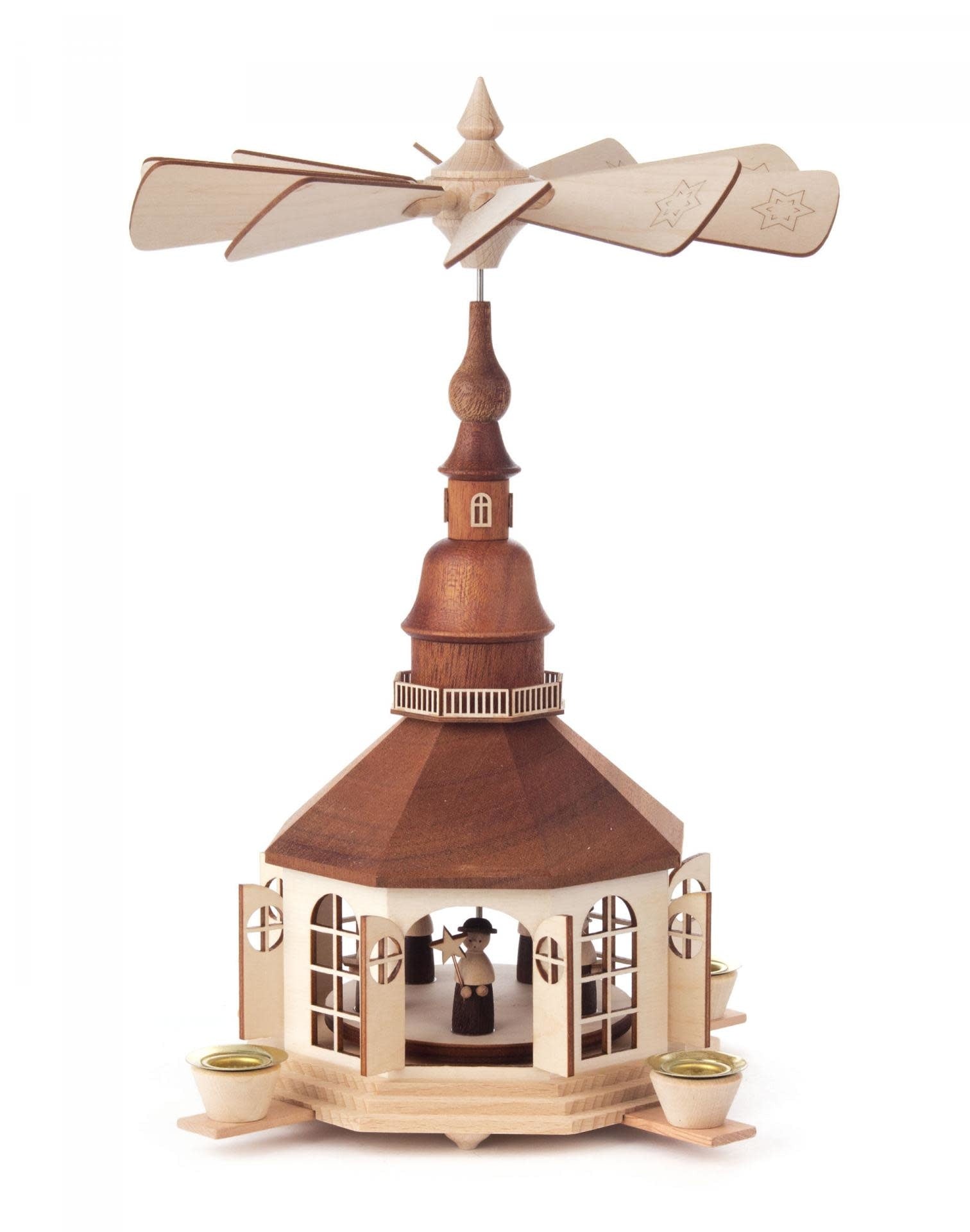 This Christmas pyramid is a masterpiece of intricate craftsmanship, featuring a detailed replica of the Seiffen Church with choir singers inside. The Erzgebirge pyramid is made from high-quality wood. The rising heat from pyramid candles moves the fan wheel located above the church tower, causing the small choir singers inside the church to rotate.