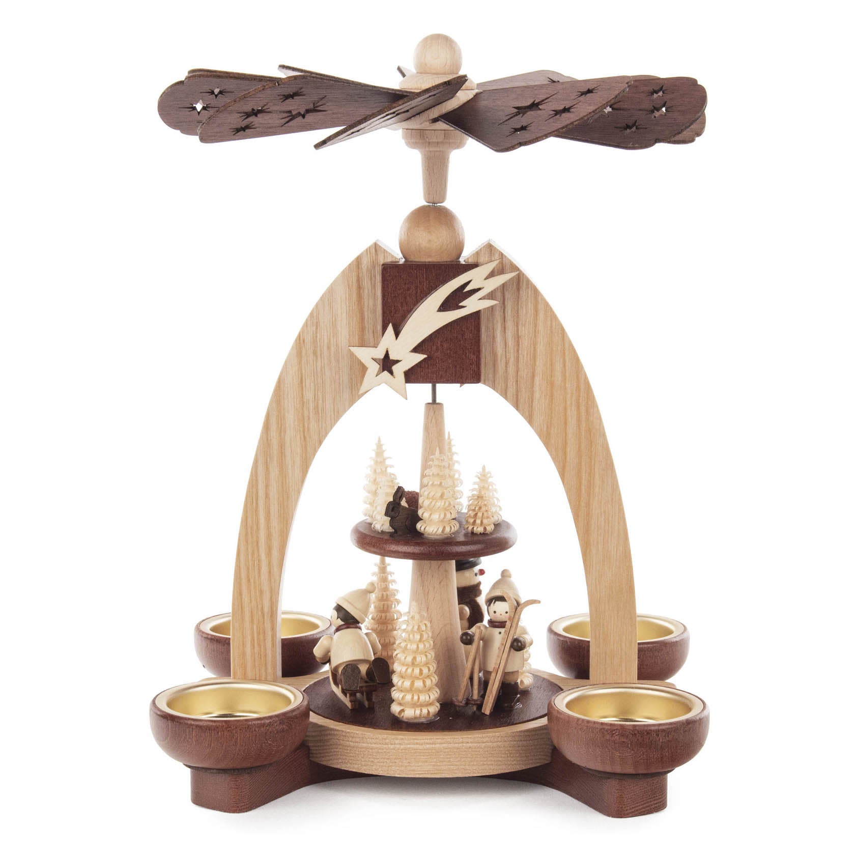 With its natural tones and dark brown accents, the Erzgebirge Christmas pyramid is a real eye-catcher in any room. The pyramid consists of two tiers and provides space for tealights. On the lower rotating platform, you can see a winter child on a sled, a winter child holding skis, a snowman, and three spiral trees. The upper rotating platform features a squirrel and a hedgehog among six spiral trees. The propeller of the pyramid is in dark brown, perfectly complementing the overall appearance of the pyramid.