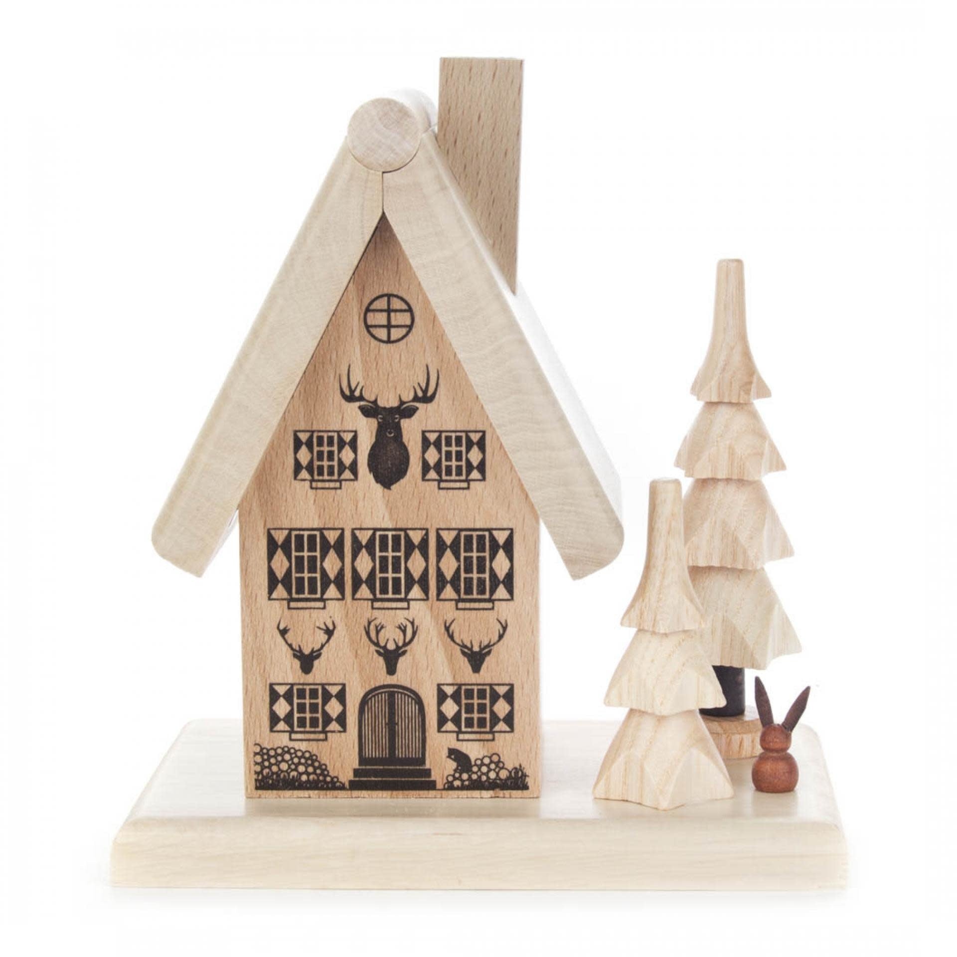 Richly decorated and adorned, this small smoker house presents itself beautifully. A little rabbit cautiously peeks out from behind a tree. Simply lift the house, light an incense cone and place it on the metal plate, replace the roof, and the chimney will start to smoke.