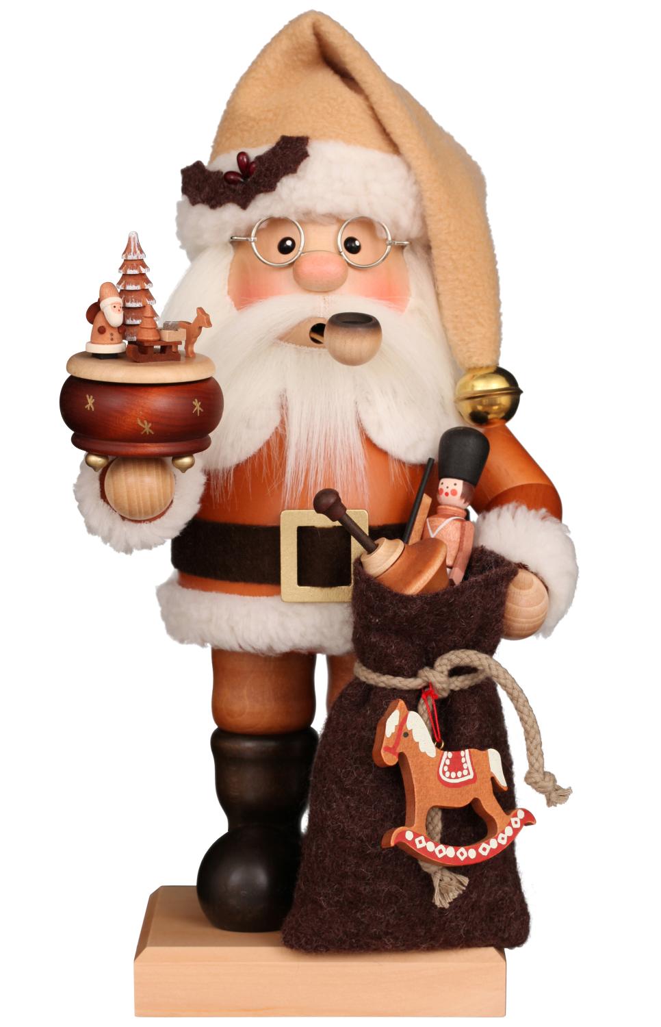 A Smoker Santa with Music Box and Gifts in a natural wood finish with incense burner, by Christian Ulbricht.