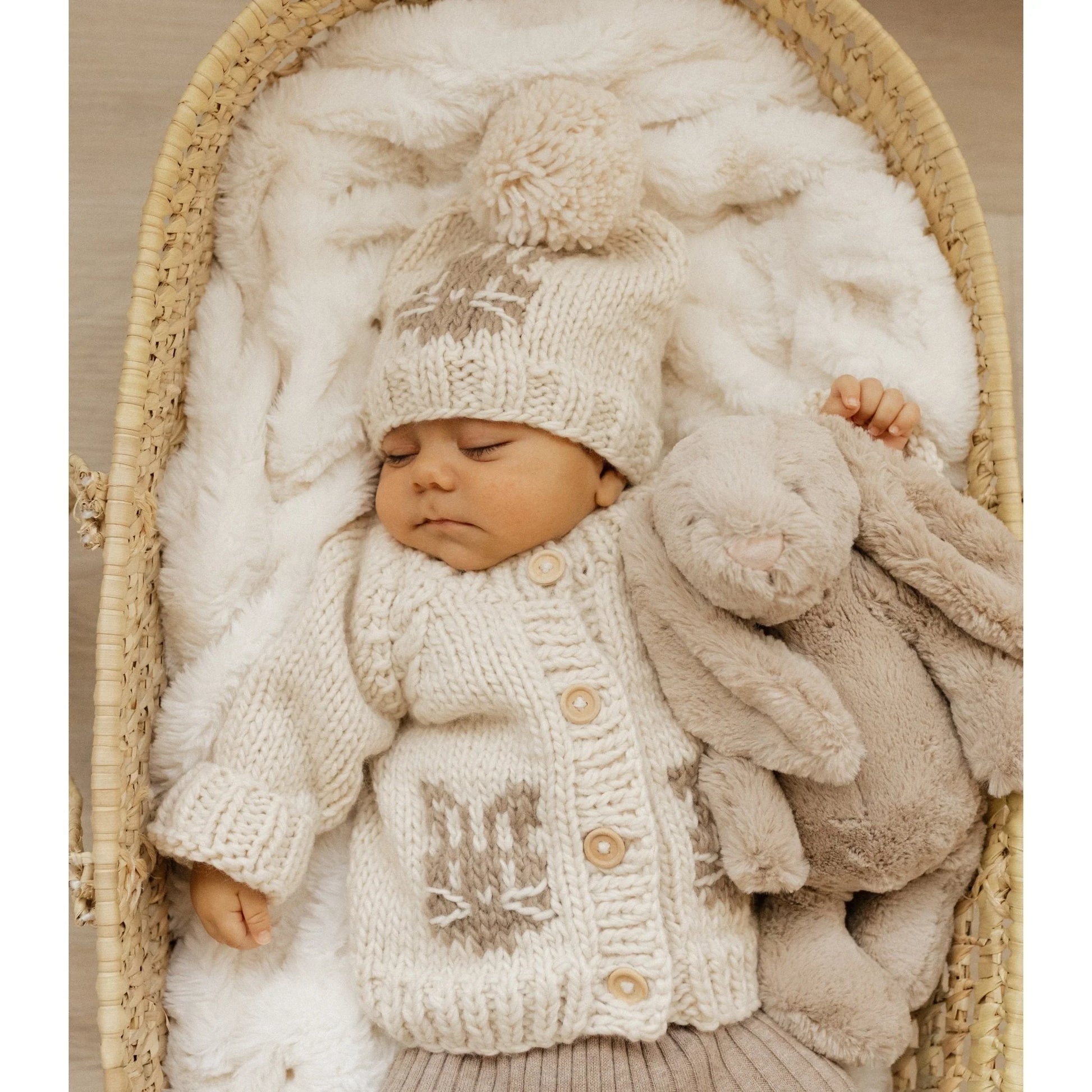 This cozy beanie hat is hand knit in natural hued yarn adorned with a cute whiskered bunny face in pebble (greige). What a fun hat for springtime and perfect for Easter!
